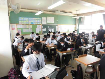 男子体育授業です。 端末を使い、調べてレポートを仕上げています。