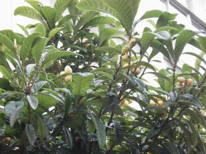 雨空をふと見上げると、びわの実がなっていました。