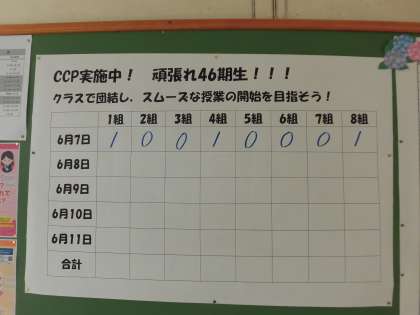 1年生はCCP(チャイム着席プロジェクト)を行っています。 クラス全員で協力してがんばっています。