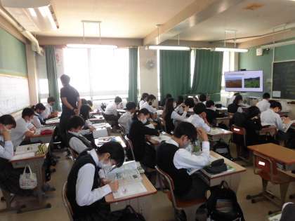 社会科授業です。 画面に出ているヒントを見て、考察します。 静かに集中しています。