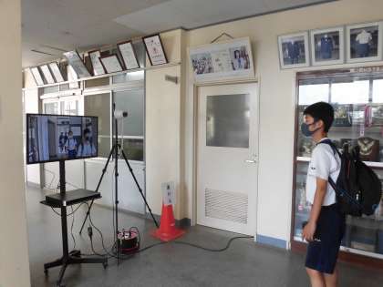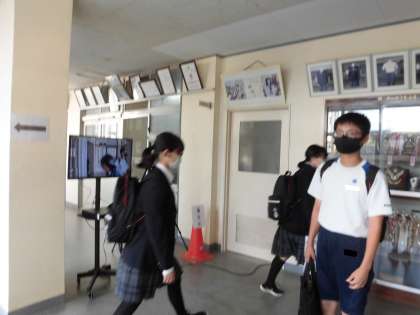 玄関前の検温も習慣になっています。 皆さん、健康観察カードを持ってそれぞれの部活動に行きます。