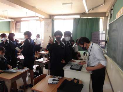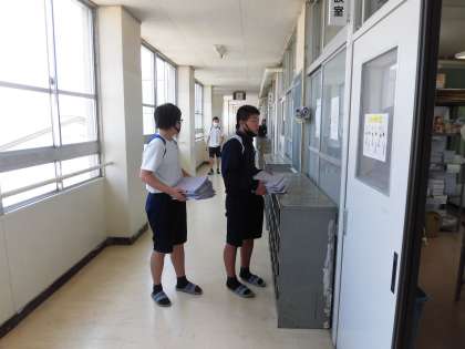 休み時間です。 係の人がクラスの提出物を回収してくれたり、先生に質問をしていました。