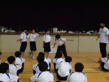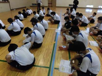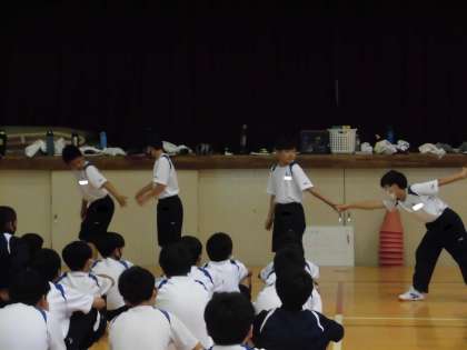 陸上競技リレーのバトンパスの練習です。 グラウンドの予定でしたが雨天のため体育館です。