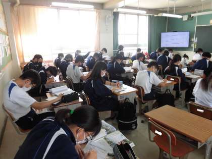 社会科授業です。 とても熱心にプリントを仕上げています。