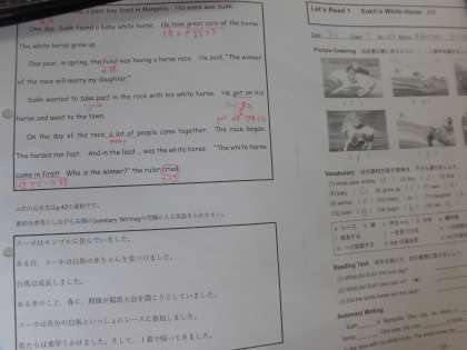 英語授業です。 教材は「スーホの白い馬」です。