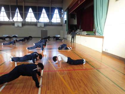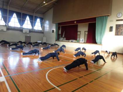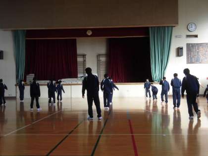 男子体育、準備運動中です。