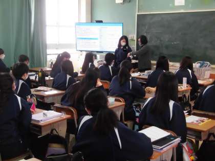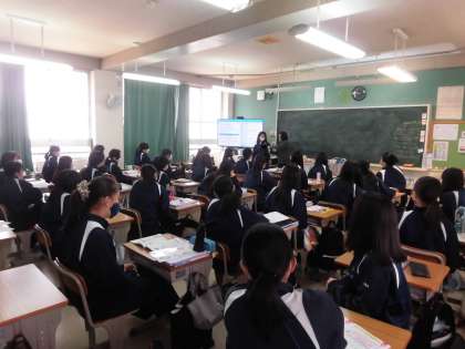 保健授業の様子です。 応急手当「包帯の巻き方」を実習しています。