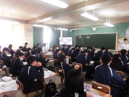 社会科授業です。 授業を見ていただいて生徒の皆さんも少し緊張した様子に見えます。