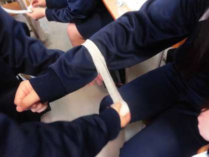 包帯の巻き方を練習中です。きれいに巻けましたね。