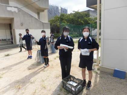 生徒会の皆さんが掃除セットを用意し、配布しています。