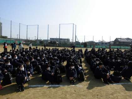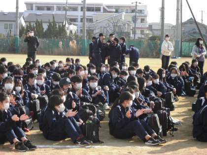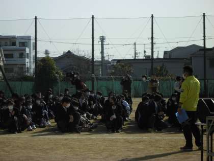 全校生徒が運動場に集まり、送る会の続きが始まります。