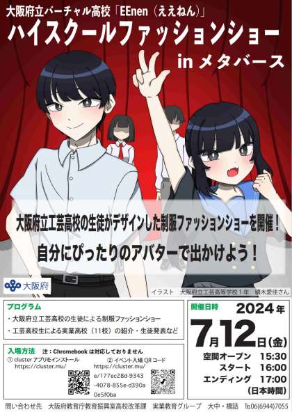 7月12日(金)、16時よりメタバース空間「大阪府バーチャル高校『EEnen(ええねん)』」におきまして、大阪府立工芸高等学校の生徒による「ハイスクールファッションショー in メタバース」を開催いた