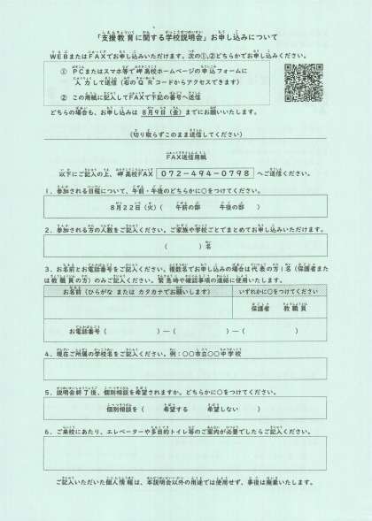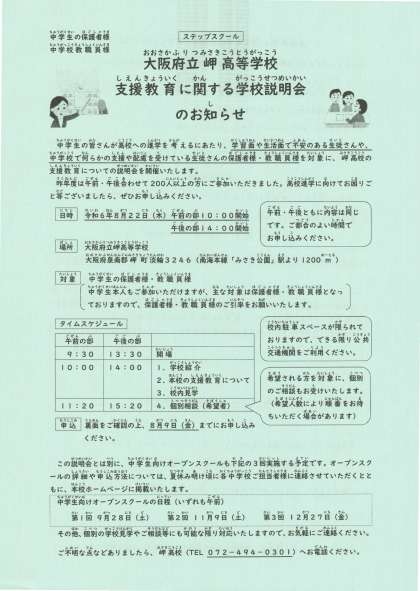 支援教育に関する学校説明会(大阪府立岬高等学校) 公開日 2024/07/11 更新日 2024/07/11 進路関係 中学生の保護者の皆様を対象にした,大阪府立岬高等学校の支援教育に関する説明会が行われます。 「高校進学に向けてお困りごと等ございましたら、ぜひお申し込みください。」とのことです。下のQRコードよりアクセスできます。 「中学生本人も参加できますが,保護者の引率をお願いします。」