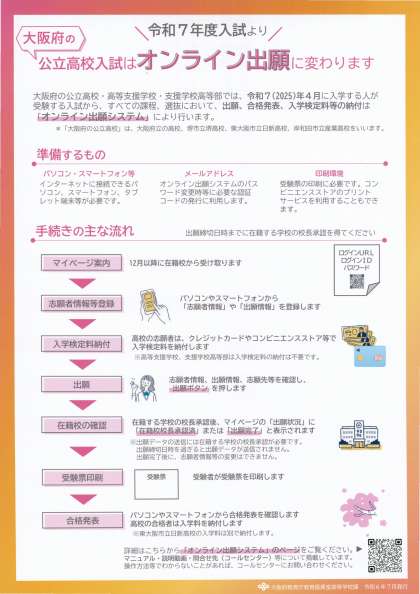 令和7年度より公立高等学校入学者選抜、府立知的障がい高等支援学校職業学科入学者選抜及び府立支援学校高等部入学者決定においてオンライン出願が実施されることを踏まえ、その利用方法や出願手続きについて周知いただくとともに、進路指導の一助となるよう、オンライン出願システムに関するリーフレットを作成いたしました。