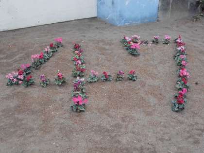 緑化委員と吹奏楽部が正門横の花壇を耕し、花を植えてくれました。3年生(47期生)の卒業記念として「47」となっています。