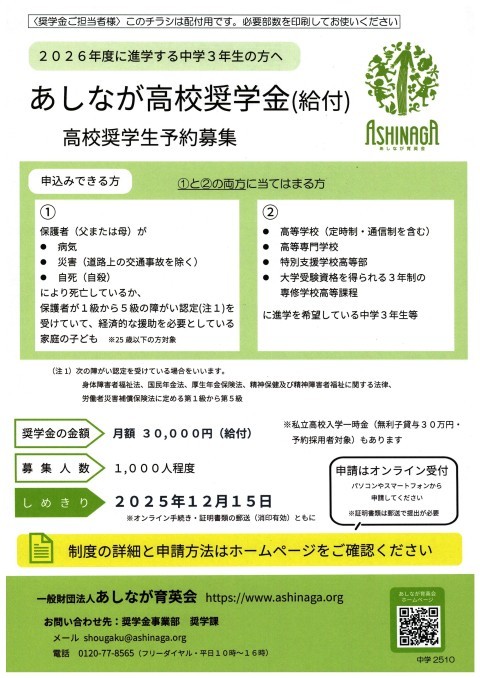 本日,「大阪府育英会予約奨学生の募集について」というチラシを配布しています。