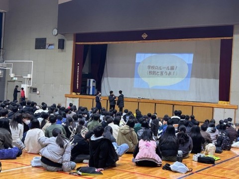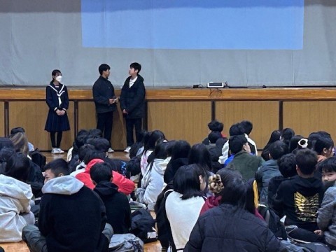 3年生は私立高校の入試を明日にひかえ、今日の5時間目に事前指導が行われました。進路指導の先生から全体的な注意があり、そのあとは受験する高校ごとに分かれて最終確認です。