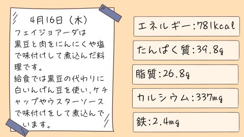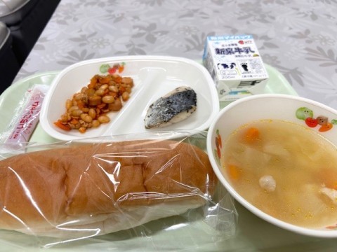 この日の献立は「コッペパン・牛乳・豚肉のバーベキューソース・じゃがいもの天ぷらチーズ風味・ミネストローネ」でした。