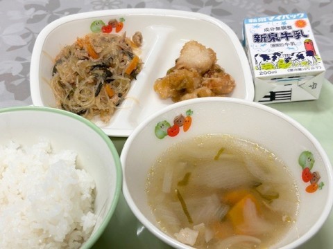 献立は「ごはん・牛乳・油淋鶏・ひじきの中華風炒め・春雨スープ」でした。