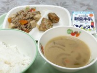 本日の献立は ●ごはん●チキンカレー●コロッケ●キャロットソテー です。