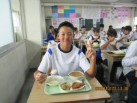 今日の献立は ●ごはん●ミンチカツ●千切りイリチー●なすのみそ汁●のりの佃煮●牛乳 です。