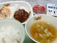 今日の献立は ●ごはん●チャージャン豆腐●バンサンスー●トマトと卵のスープ●牛乳 です。