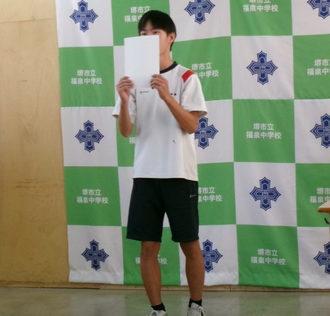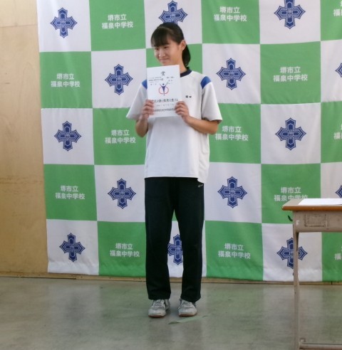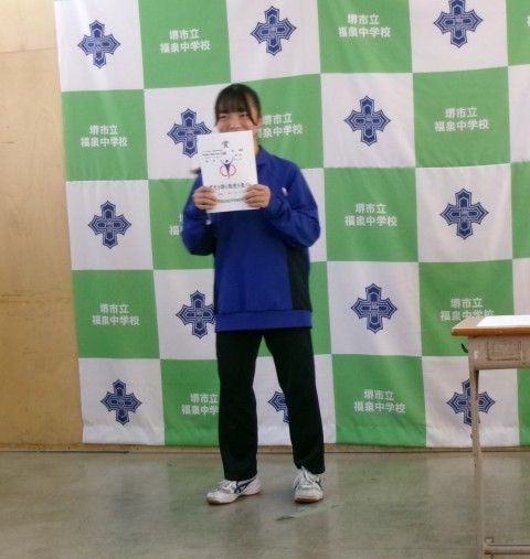 6時間目に「クラブ表彰」を行いました。各クラブの活躍とてもうれしく思います。まずは陸上部です。泉北秋季大会と堺市総体で活躍してくれました。2年女子100m、200m、男子200mでの表彰です。