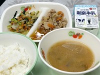 この日の献立は「ごはん・牛乳・豚ロースのピリ辛炒め・ごまじゃこ和え・さつま汁」でした。