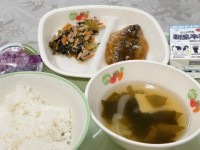 献立は「ごはん・牛乳・いわしのかば焼き風・小松菜と豚肉の甘辛炒め煮・若竹汁・フルーツゼリー」でした。