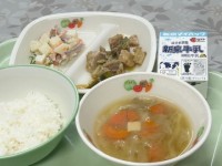 献立:ごはん カレー豆腐 揚げギョーザ にら卵スープ 牛乳 おいしくいただきました。