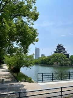 広島城の横をバスで通り過ぎ、これから平和学習に向かいます