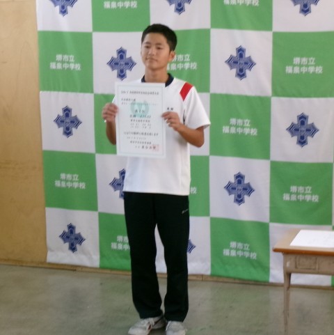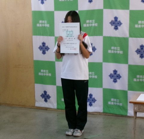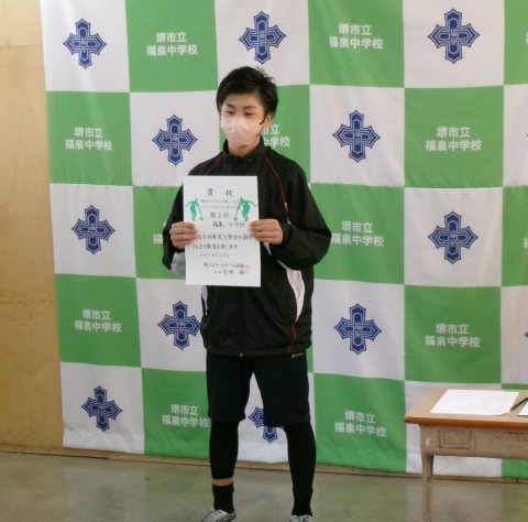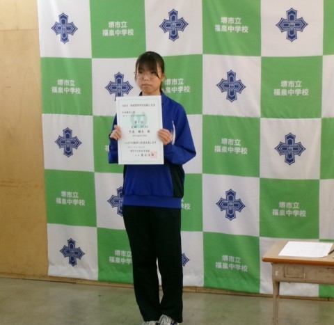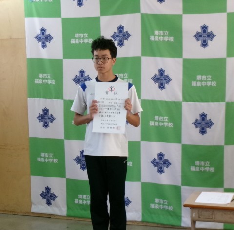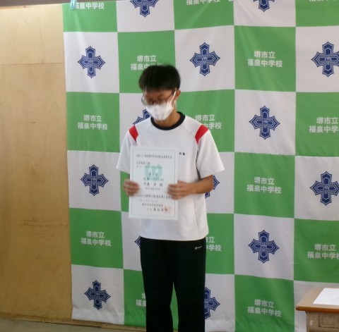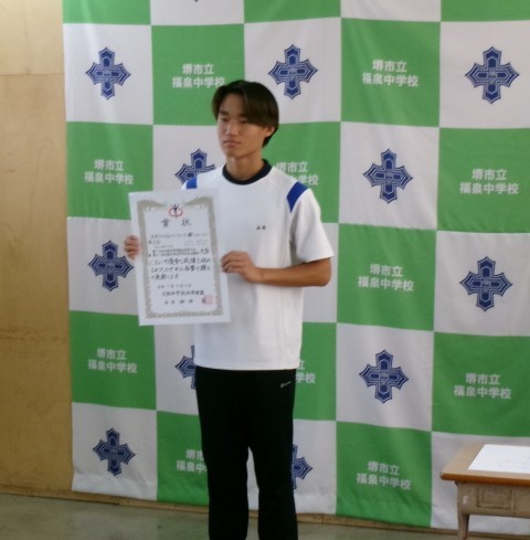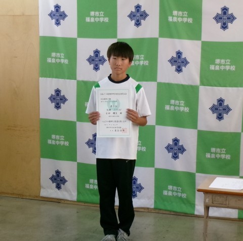 第77回堺市中学校理科展「優良賞」の表彰伝達です。これからも理科への興味関心を忘れず研究してください。