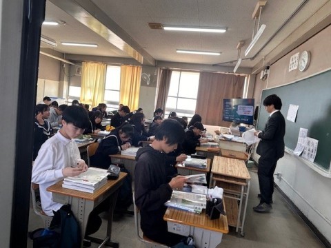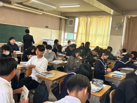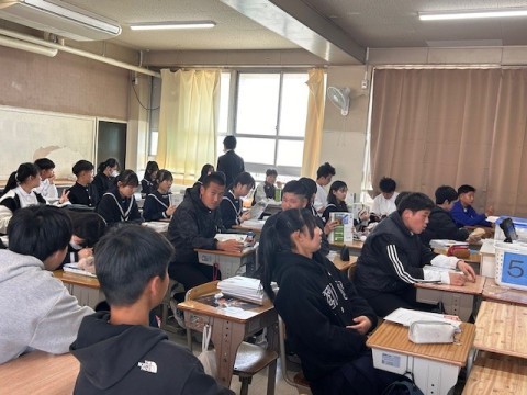 3年生は私立高校の入試を明日にひかえ、今日の5時間目に事前指導が行われました。進路指導の先生から全体的な注意があり、そのあとは受験する高校ごとに分かれて最終確認です。