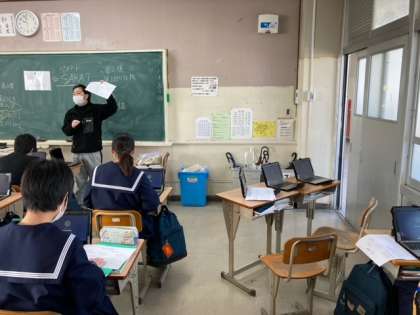 緊急事態宣言のため、講話形式ではなく、講和していただく予定をしていた企業のうち、日本免疫粧研さんと、幸齢舎さんから、今回する予定であったお話を動画に編集してを送っていただきました。本日はクラスごとにその二つのうちの一つを選び、もう一つは後日見る予定です。また、この職業講話の取り組みに全面的に協力していただいた地域教育振興課の方が2人、動画を見ている様子を見に来ていただきました。