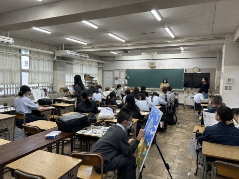 国語は生徒のプリントを大型テレビに投影して授業しています。