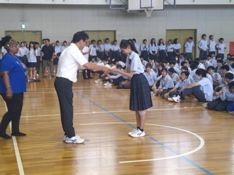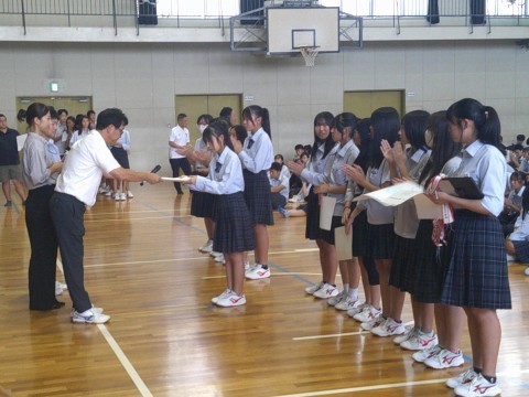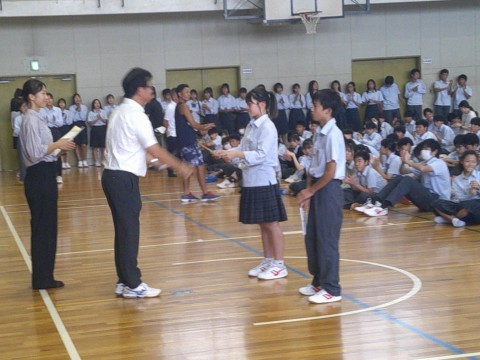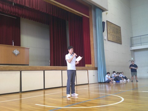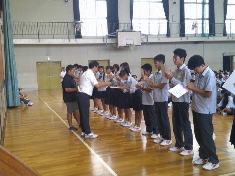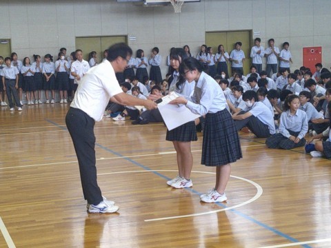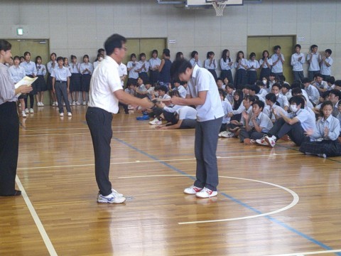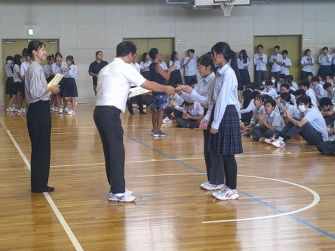 全校集会を行い,校長の話の後,各部や個人の表彰や生徒会役員の認証式,生徒会から学校生活をよくするためのキャンペーン実施の説明がありました。