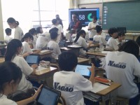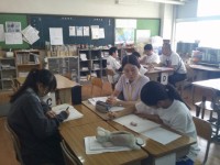 英語の授業では,2クラスともにモニターに映った単語を発声し,意味を確認していました。社会科は,東海地方の農業について学習していました。モニターには,ビニールハウスでの菊の栽培の様子が映っていました。