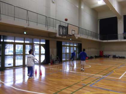 体育館で練習を行っています。パスを受けてシュートをする練習を繰り返し行っています。シュートはなかなか難しく、決まることがなかなかありません。これからも練習をし続ける必要がありそうです。