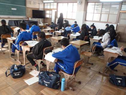 1、2年生は来週に行われる学年末テストに向けて、3年生は入試に向けてそれぞれ学習に取り組んでいます。難しい問題は先生に聞くこともできます。また、生徒同士で教えあっている場面も見られます。2時間の限られた時間ですが、有意義なものになるといいですね。