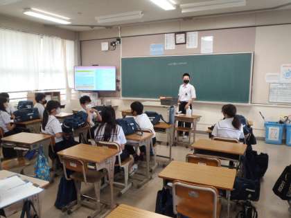 写真は、生徒会執行部、1年生学級代表、3年生学級代表です。