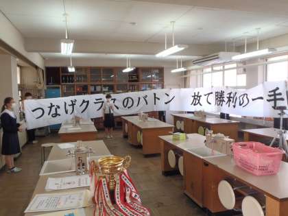 初めに体育大会のスローガンの発表と出来上がった横断幕の披露がありました。立派な横断幕が出来上がりました。