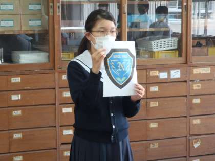 次に長中のエンブレムが出来上がった報告がありました。生徒から募集したエンブレムの中から最もいいものが選ばれました。これ以外にもたくさんの応募がありました。ご協力ありがとうございました。