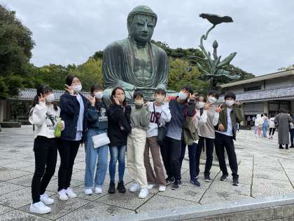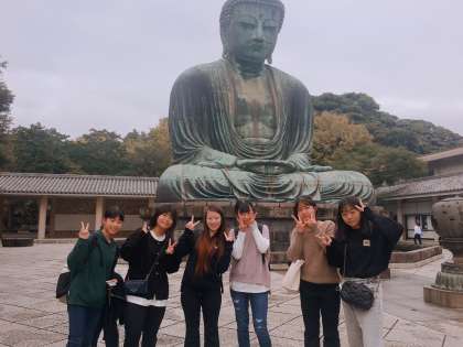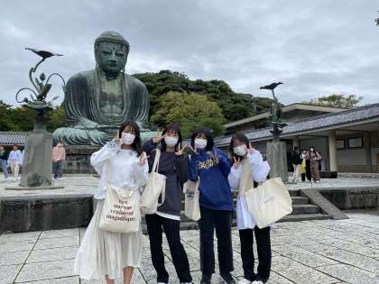 鎌倉大仏のチェックポイントで、写真を撮ってもらっています。