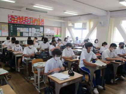 24日(水)までの3日間、午前中4時間の予定で補充学習が行われます。1時間目は、学活です。夏休みの宿題などが集められました。さすがに、今になって慌てている生徒はいないようです。