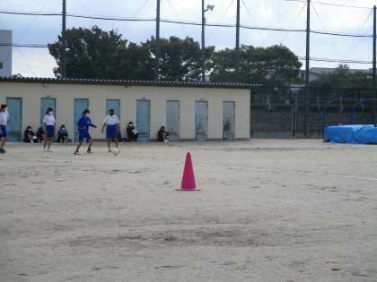 男子体育は、バレーボールの授業です。相手コートのボールを3回で返す練習をしています。この形がどうしていいのか考えながら練習しています。ボールをつなぐのはなかなか難しいです。