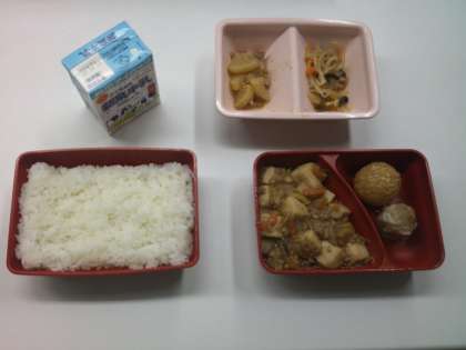 本日の給食は ごはん,麻婆豆腐,点心,もやしの甘酢炒め,大根のうま煮,牛乳