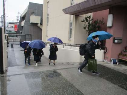 あいにくの雨の朝です。みんな傘をさしての登校です。中には重い荷物を抱えながら登校する生徒もいました。 今週は、3年生は卒業テストもあり行事的には厳しい週です。頑張りましょう。