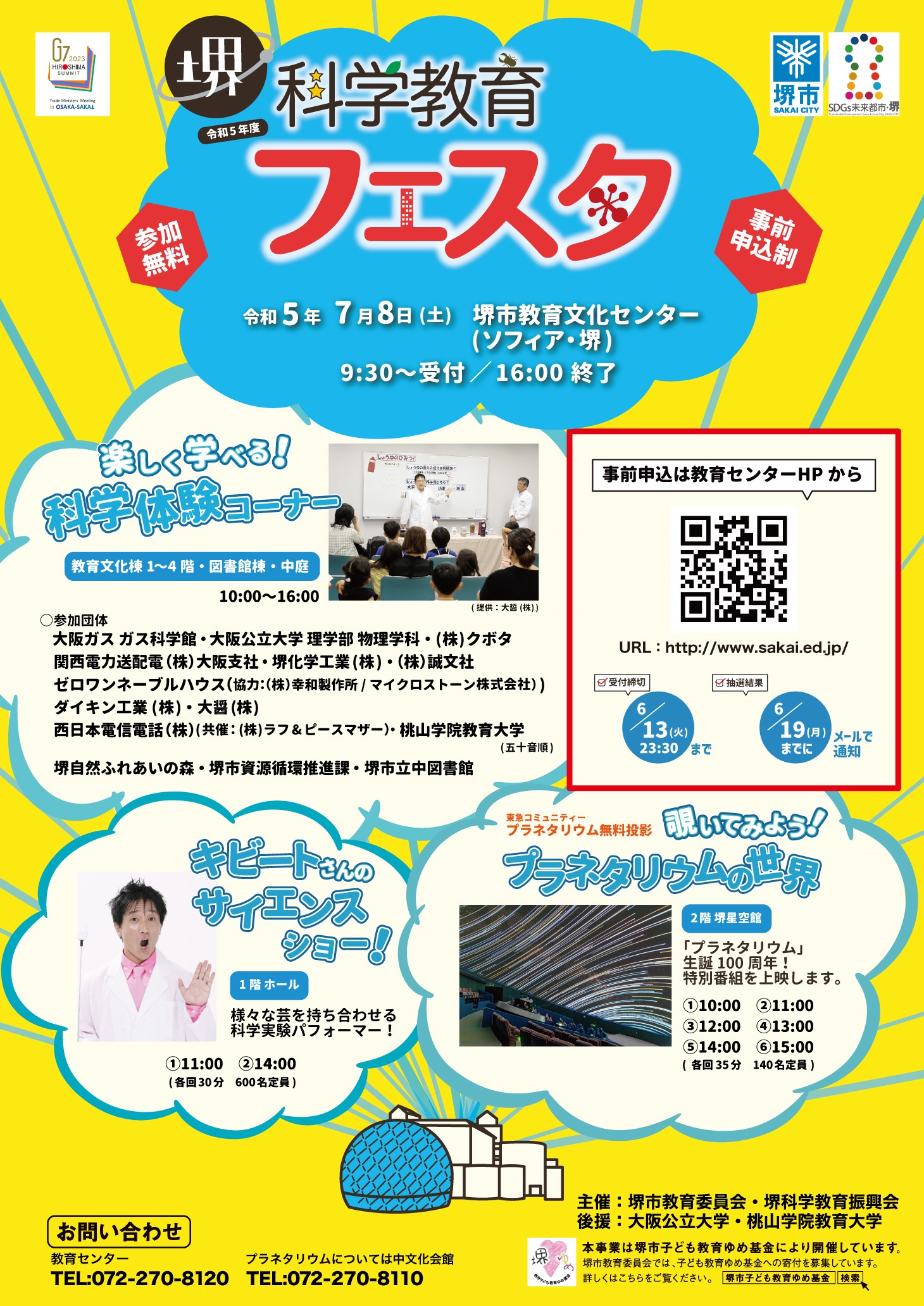 令和5年7月8日(土)10:00〜16:00堺市教育文化センター(ソフィア堺)で令和5年度「堺科学教育フェスタ」が開催されます。