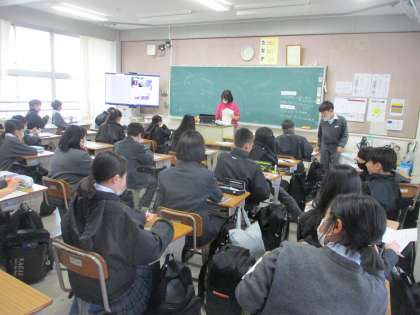 英語Aの授業は、本文の発音に方法を学習しています。ただ単語を発音するだけでなく、相手に伝えるために大きくアクセントをつけて読むところ、抑揚をつけて読むところなど発音にも工夫が必要です。グローバル化の時代コミュニケーションをとるためには必要な技術です。しっかり頑張りましょう。