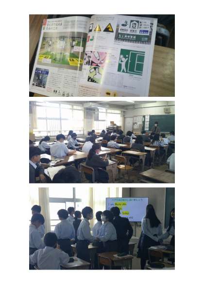 美術の授業では、ピクトグラムについて学んでいました。日本では1964年の東京オリンピックから採用されたそうです。英語の授業では、ペアで自己紹介をしていました。楽しんで英語で会話していました。